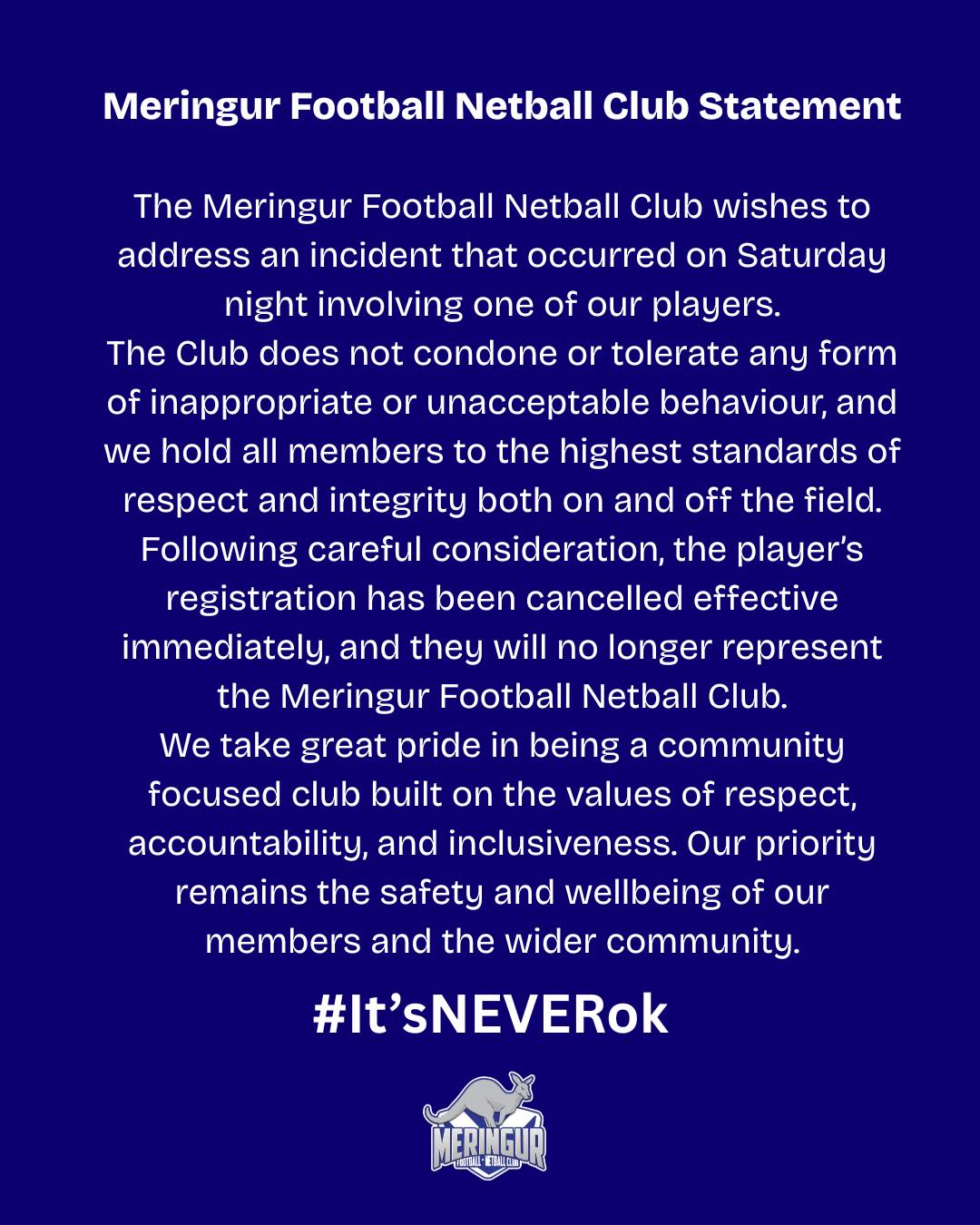 It added that the club held all its members to the highest standards of respect and integrity both on and off the field.