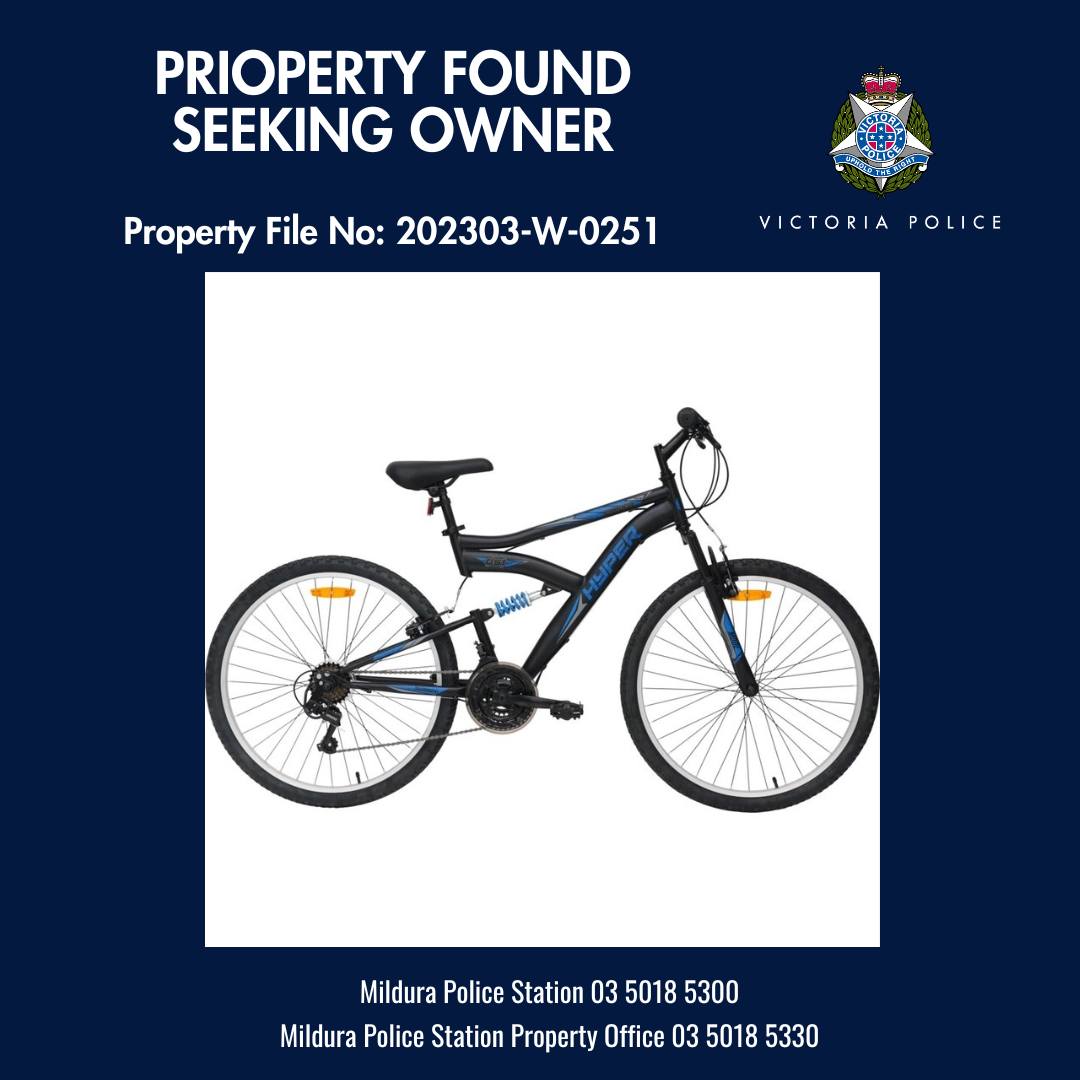 Mildura Police are seeking public assistance to locate the owner of a Hyper dual suspension mountain bike that was located at Green Pines Park, Muscat Court, Mildura, on 4th March 2023, and taken to the Mildura Police Station.