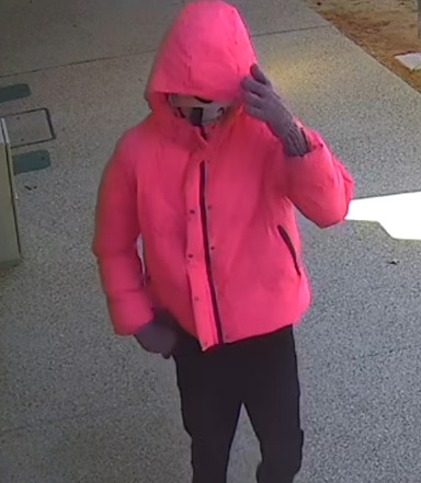 The offender is described as being of thin build wearing a face covering, pink hooded puffer jacket, brown gloves and black pants.